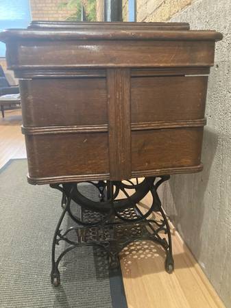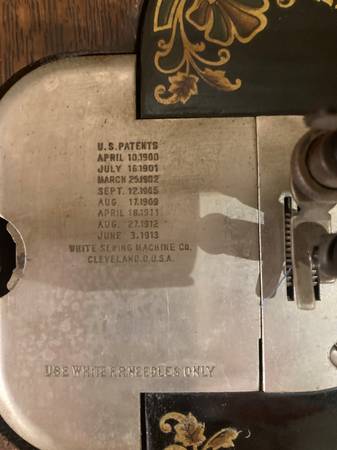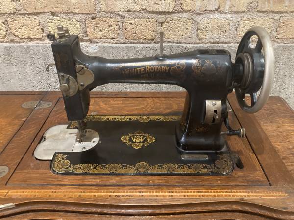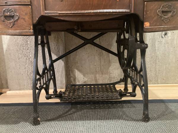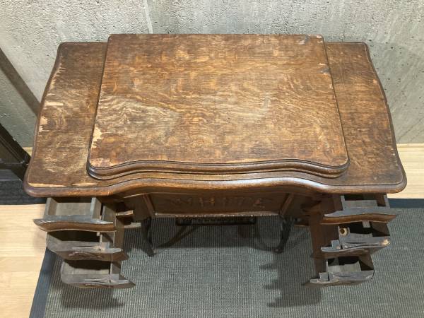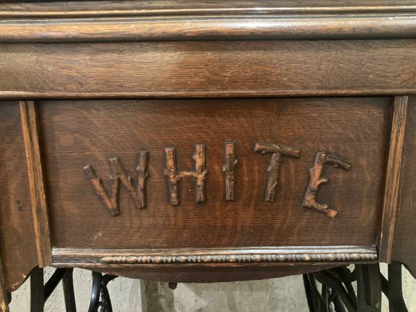 Antique White Rotary Treadle Sewing Machine "Twiggy" cabinet. Twiggy refers to "White" name on face of cabinet that is spelled out in bamboo twigs. This tiger oak cabinet is the 6 drawer model where top drawers on each side appear hidden by absence of a pull. Sewing machine is on a cable lift so it lifts into place as top lid is opened. Iron base has all four wheels.