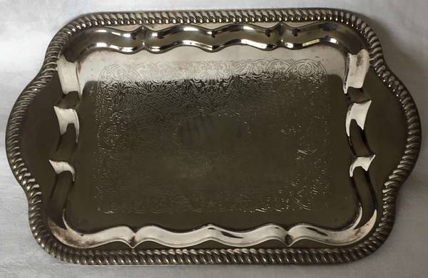 Silver plate "Reed and Barton, Mayflower" gravy set, plate and cup, 7.5" long x 2.5" tall, $20