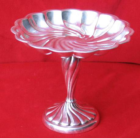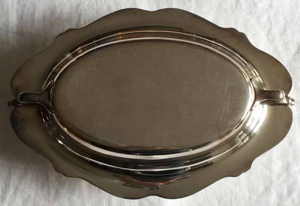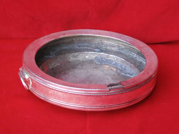 Silver plated chafing hot water for warming or ice for cooling dish manufactured by the Sheffield Silver Co. with cover and wood handle, 6" round x 2.5" tall, $20 or better offer