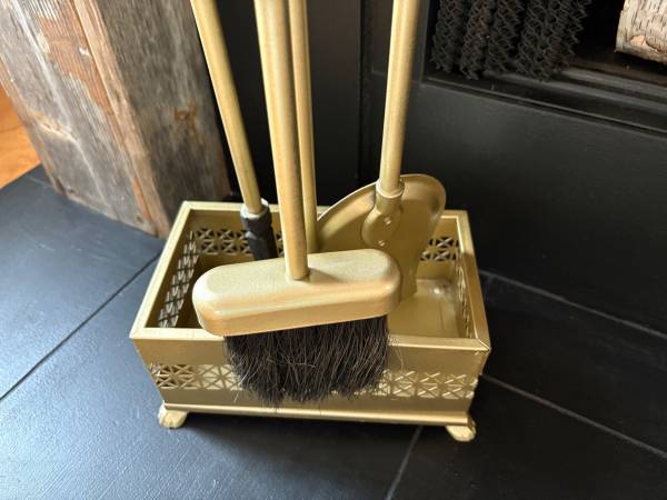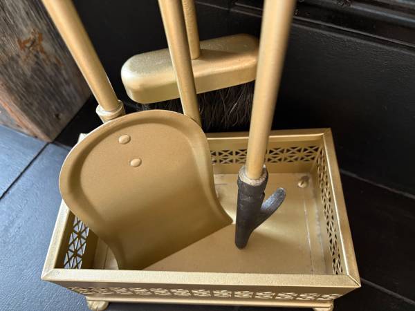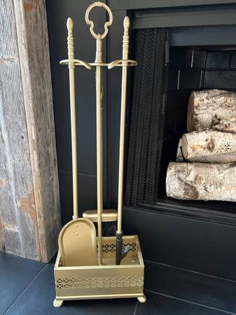 This vintage 4-piece iron metal fireplace tool set is heavy duty and in EXCELLENT CONDITION. Includes cast-iron tipped poker, riveted shovel, hanging broom on backside, and sturdy stand. The base is MCM style with its geometric design and vintage claw feet. Marked "No. 8 BASE LEG" twice on the bottom of the stand. This set has been painted with 4 coats of Rust-Oleum aged brass, metallic gold to give it a modern aesthetic with its Old World style. This functional fireplace tool set adds a touch of elegance to your home decor.