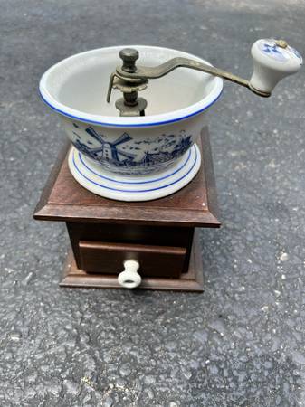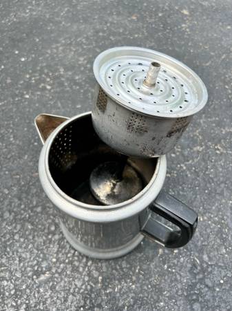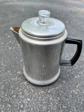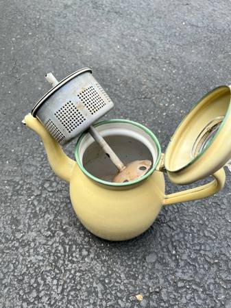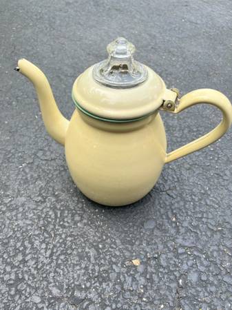 Antique cast iron coffee grinder $50 Aluminum coffee percolator $25 Yellow coffee percolator $50