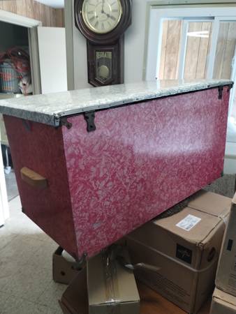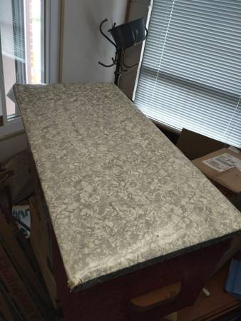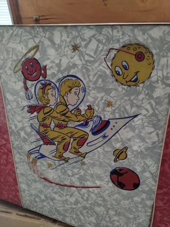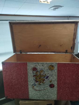 Nice condition Spaced Themed child toy chest. Made of plywood covered in vinyl very clean small tear on cover right corner. $20. 15" x 31" x 16" deep.
