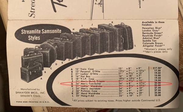 Vintage 1930s (?) Samsonite Streamlite Style 24” Men’s Two-Suiter Suitcase. 24” Long, 8” Deep, 17+1/2” Wide. Manufactured by Shwayder Bros. Inc. Denver Colorado. Brown. Good used condition. No Key.