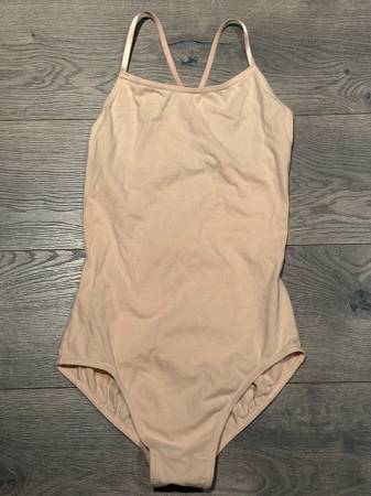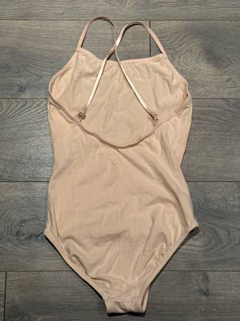 The light ballet pink colored leotard has adjustable spaghetti straps that a can be attached in the back 3 different places whether you want the straps crossed, straight down, or more to the sides, and is $6.