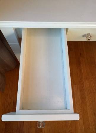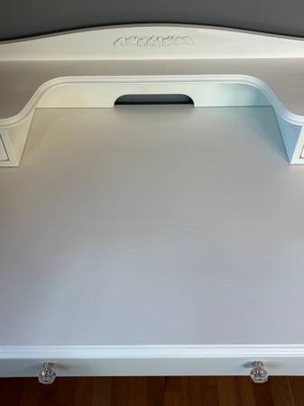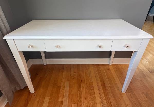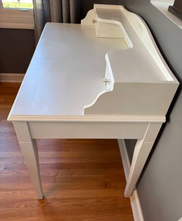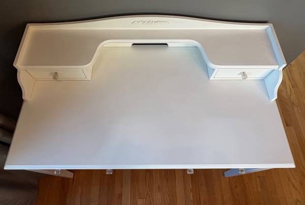 Originally retailed new for $1,200 total for the 2-pieces in a cream, hand distressed finish. However, I didn't like the yellowish tint to the paint, so I sanded it down, primed it, and painted it with 3 coats of bright white to give it a fresh, modern appearance and looks like a new desk! Mounting screws are included if you want to securely attach the hutch to the desk via the hardware on the backside. It is in EXCELLENT CONDITION from a clean, smoke- and pet-free home.