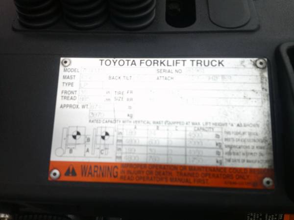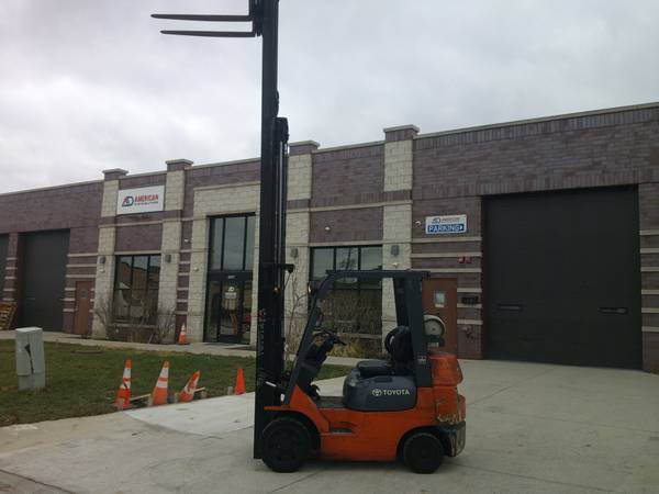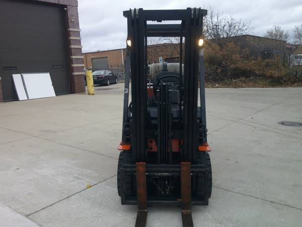 5000 LB. Capacity Toyota Forklift, Model # 7FGCU25, propane gas, traction tires, 2792 hrs., one owner, very well maintained, no leaks or issues, 3 stage mast, max lift height is 15'-9" high, side shifter, 42" forks, digital display, lights, premium seat, turn signals, we can offer delivery, propane tank is extra, come take a test drive at the warehouse, asking $9500., contact is Tim.