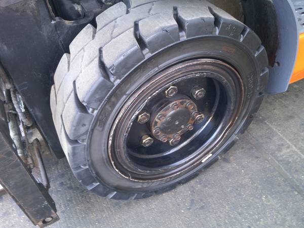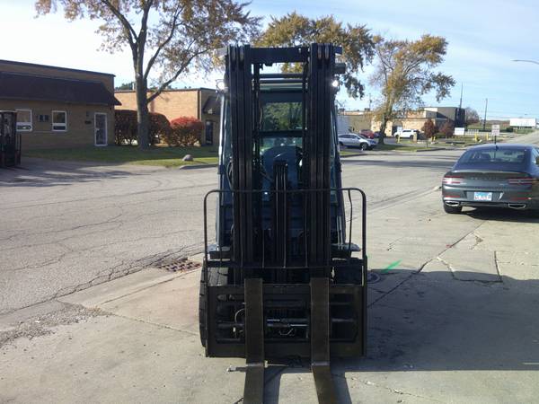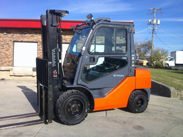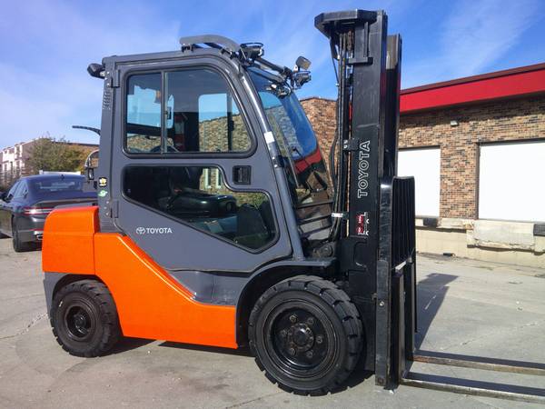 Pneumatic 6000 LB. Capacity 2019 Toyota Forklift, Model # 8FGU30, propane gas, solid pneumatic traction tires, 2701 hrs., ideal yard truck, full cab with removable doors, triple tier mast, lifts 15'-7" high, side shifter, fork positioner, 60" forks, lbr., heater, fan, windshield wipers, digital display, lights, strobe light, back up alarm, good seat, turn signals, onboard fire extinguisher, front & rear blue safety spotlights, ready to work, we can offer delivery, asking $16,999., contact is Tim.