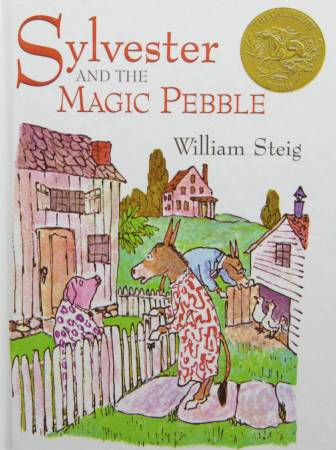 SYLVESTER AND THE MAGIC PEBBLE by William Steig - new paperback - Caldecott Medal winner for best illustrations - a funny story about a donkey who finds a magic red pebble - When he accidentally turns himself into a big rock, he wonders if he'll ever be a donkey again and rejoin his family. $5