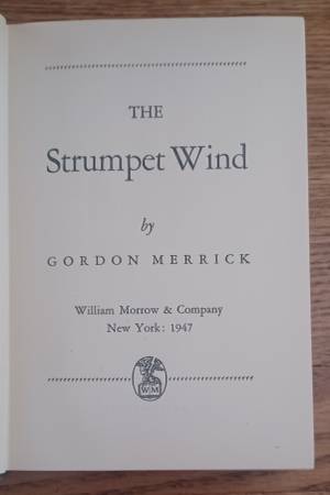 The Strumpet Wind 1947 Vintage book by Gordon Merrick, 248 pages. Hard cover book in very good condition. Reading pages in very good condition. Dust cover in acceptable condition. The name of a person was written inside the front cover , which can be whited out. Near Route 60 and Peterson Road in unincorporated Grayslake.