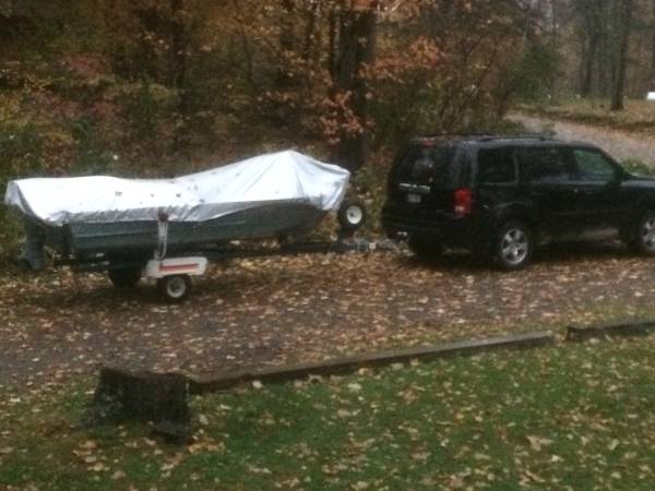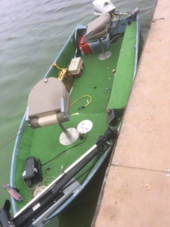 14 foot boat with casting platform. 18 HP Evinrude with new water pump. I gave it fresh gas and it turned over right away. Trailer is the homebuilt and could withstand a nuclear attack. Foot mounted...