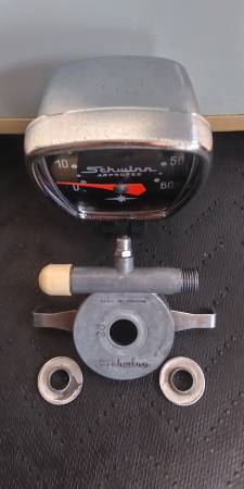 Have Old Schwinn Fiesta 1966, Ladies girls single speed cruiser 26", Original paint and parts, Frame tank with working electric horn, Chain guard, S seat, Fenders front has top crusty area, Needs wheels and grips. Nice for age, First $ 75 CASH -- Have Old Used Schwinn Approved Speedometer 1960s ?, France made, Complete for 26", Nice gauge face, Clear clean glass, Chrome clamp mount, Case lightly marked in areas, Odometer reads almost 500 miles, Cable with housing 23 1/2"s , Wheel 26" hub spoke drive, Works shows very slight age, Off 1971 three speed lightweight, $ 100 CASH -- Pickup Only -- Milwaukee Airport Area -- Call no answer leave message / E-mail name with phone number