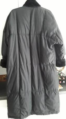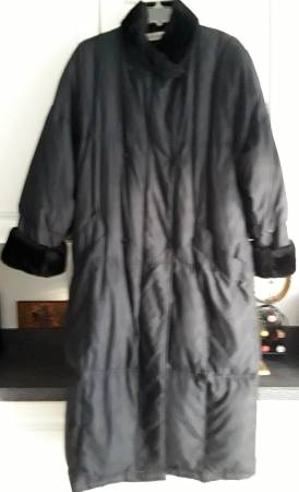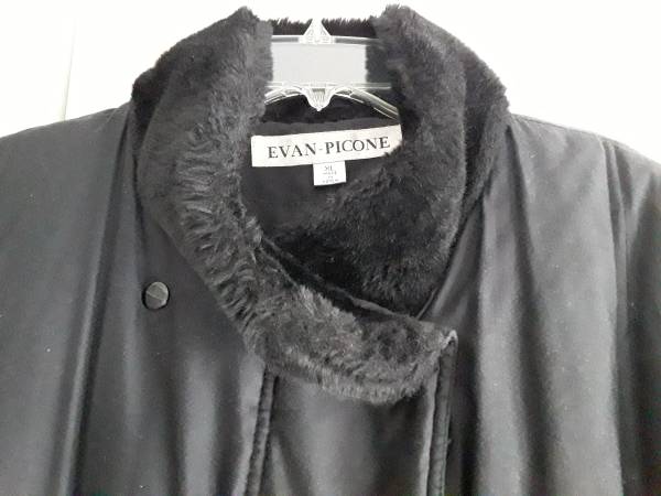 EVAN PICONE LONG BLACK PUFFER WINTER COAT with FAUX FUR COLLAR + TRIM - lining + snaps + zipper - lightweight and very warm - 52" length - size women's XL - made in Korea - excellent condition - $49