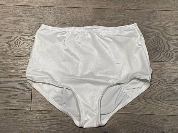 The white 2-piece by KELLE features a high neck snap closure with nude mesh material above the appliqué sweetheart neckline. Fully lined, stretchy bra top with 2 back straps. The long white sheer flowing fabric is pretty with movement over the white brief bottoms. $10