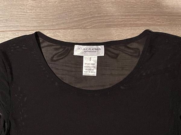The long black sheer dress by DOUBLE PLATINUM has no pattern in it (photos show lighting effects). The dress looks great over a bra top and briefs/dance shorts, or a leotard/unitard. The material is very stretchy, cap sleeves, and side slits on each side from the bottom for performing any moves. $6