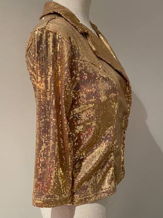 The gold fully sequined blazer by BALERA is a showstopper! Features lapels that lay flatly,3/4 length sleeves, and 2 front snap closures. The material stretches so you can move in it easily. If you want to be noticed and make a statement, this is the jacket to wear! $7