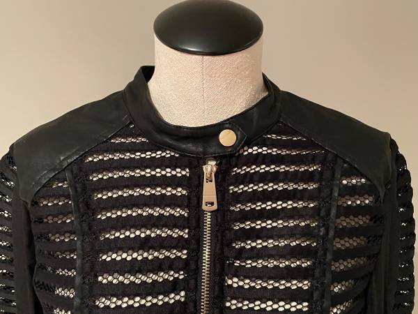 The black Vegan leather long-sleeve jacket features a front gold zipper and neck snap. Its linear design is modern and stunning. You can see through the mesh fabric in between each horizontal line. There are 2 faux lower front pockets. The bodice is fitted and the material has some stretch to it. Can be worn with jeans, leggings, dressy pants, skirts, too! $9