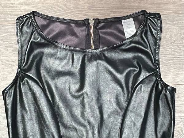 The black Vegan leather sleeveless top by WEISSMAN features a gold zipper back and 2 angular ruffled layers at the bottom. The bodice is fitted and the material has some stretch to it. Can be worn with jeans, leggings, dressy pants, skirts, or shorts too! $8