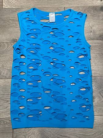 The royal blue sleeveless top from BALERA is size S/M as the material stretches. Can be worn over a bra or tank top as there are many holes for an 80's fashion or hip hop style. $1