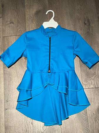 Royal blue zippered jacket with double ruffled bottom trim by KELLE. Can be worn with leggings, dance shorts, or a skirt. $2