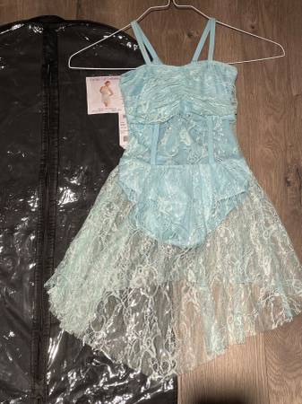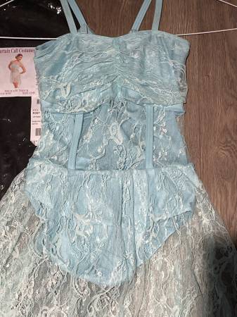 Light blue one-piece leotard with sheer lace overlay by CURTAIN CALL COSTUMES. $5