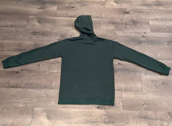 Youth Large Size 14/16 zippered hoodie in dark green with gold and white embroidery accents with team name and logo (no cheap screen print decal), front pockets, and hood for $18.