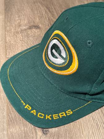 LIKE NEW green structured hat by Sports Specialties features "G" team logo with raised embroidery on the front, "PACKERS" in gold on the right side, and "GREEN BAY" in gold on the back adjustable velcro strap closure for $20.