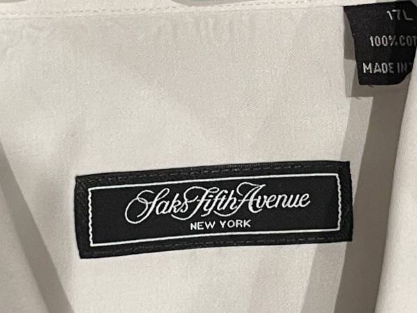 This white long-sleeve, button-down dress shirt from SAK FIFTH AVENUE NEW YORK is made of 100% cotton. Features crisp collar and French cuffs with black button cufflinks. It has a hidden button placket, and there's an extra button attached. Approximate size 17-17 1/2 L.