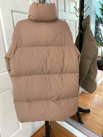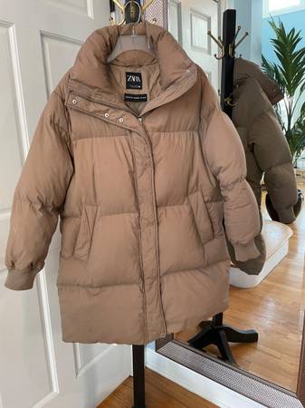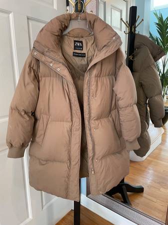 ZARA Brand beige-taupe colored duck down puffer jacket, Selected Thermal Edition! Purchase price was $219 plus tax. Only worn twice, unfortunately too big--in EXCELLENT CONDITION with NO stains, tears, or worn areas and comes from a clean, smoke- and pet-free home. Mid-length, lightweight coat that is water repellent, provides wind protection, and keeps you warm during cold weather! Features 2 lower side pockets with snap closure, a hidden inside zippered pocket in the upper left side, full center zippered front, and full center snap front for double closure if desired. Water repellent and wind protection soft and comfortable nylon shell. This modern and cold weather functional women's puffer coat is similar in style to Aritzia super puff, Frankie shop, and Ganni!