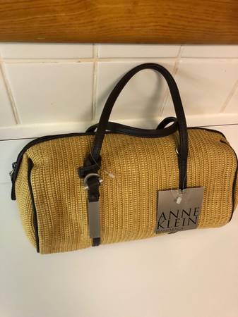 Anne Klein textured yellow cylinder handbag with brown leather trim, never used and with a price tag indicating reduced from $120 to $84, 10x6x5. Asking $25.
