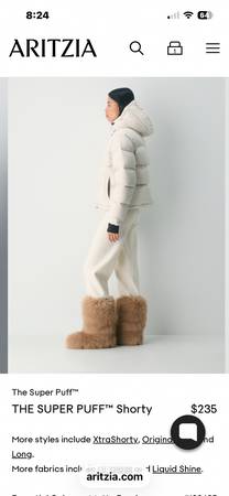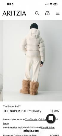 Aritzia Super Puff Shorty Cropped premium down puffer jacket. Size: small Color: Matte Pearl Very warm, nice condition, some stains. Currently $235 on the Aritzia website....