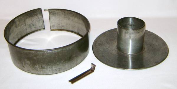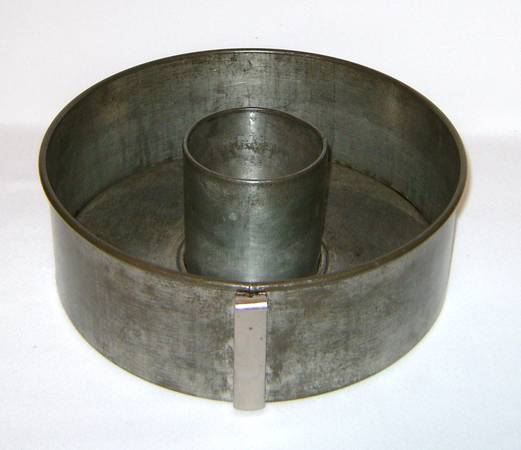 vintage metal angel food cake pan with a side opener for easy removal of the cake. Pan measures about 9" across, has a 3" center hole and is 3 ¼" tall. When the sliding piece on the side is removed, the outside of the pan comes away from the base so the cake can be removed without difficulty. Manufacturer name is not marked on the pan. My best guess is that the pan dates from the 1930s or so.