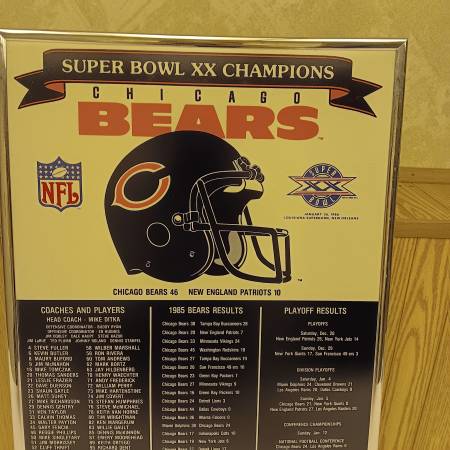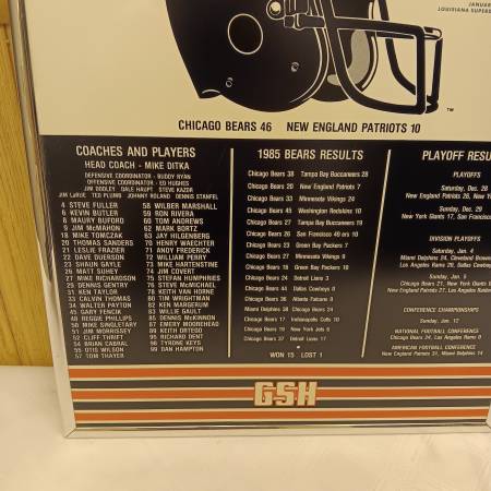 This 1985 Chicago Bears Super Bowl Champions collectable roster is looking for a new home. Much cheaper than e-bay, get it today, makes a great holiday gift for that Bears fan in your life! Priced to sell! Contact me with any questions or concerns. Thanks for viewing my post.
