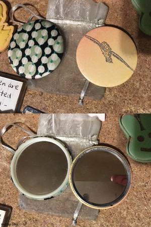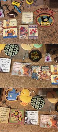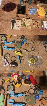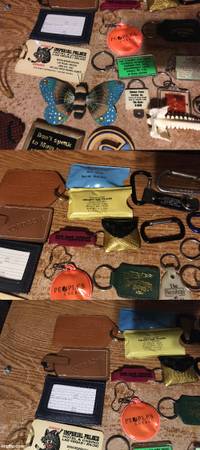 ALL IN GOOD-GREAT CONDITION. EXCEPT THE NEW MEXICO KEYCHAIN, HAS A COUPLE CHUNKS OUT OF IT, JUICY FRUIT IS LOOSE, SHOWN PICTURE 8. CHICK MAGNET MAGNET IS LOOSE, BARBARA'S KITCHEN HAS A CHIP ON IT. 3 LUGGAGE TAGS, 3 ROLL UP PLASTIC TRAVEL BAGS, 6 CLIPS, 41 KEYCHAINS, 20 MAGNETS SOME EXTRA CHAINS. 2 POCKET MIRRORS