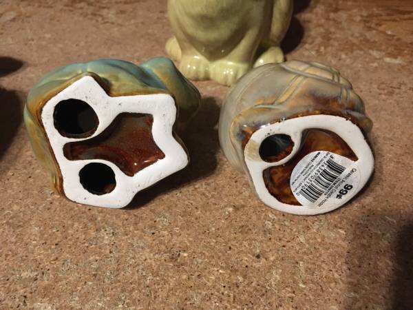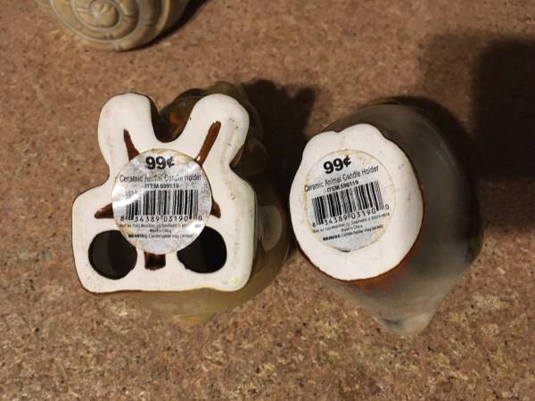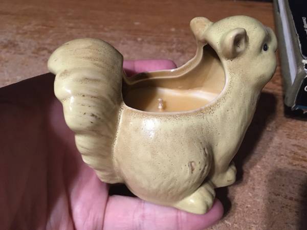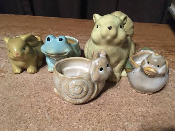 CASH ONLY 4 SMALLER VOTIVE CANDLE HOLDERS. DUCK, FROG/TOAD, RABBIT SNAIL, FROG/TOAD HAS A SMALL CHIP IN IT SHOWN IN PICTURE 11 BIGGER SQUIRREL HAS A CANDLE IN IT UNUSED. SMALL ONES ARE LIKE 3"...