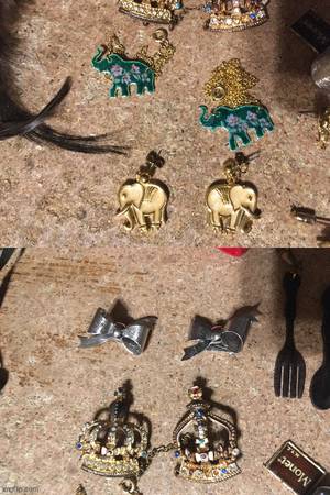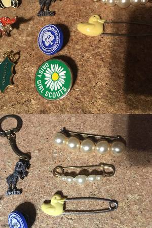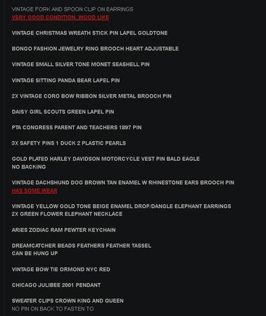 CASH ONLY LOT OF JEWELRY PINS EARRINGS BONGO RING ELEPHANT DOG PANDA BEAR GIRL SCOUTS PTA VINTAGE FORK AND SPOON CLIP ON EARRINGS VERY GOOD CONDITION. WOOD LIKE VINTAGE CHRISTMAS WREATH STICK PIN...