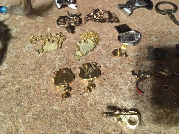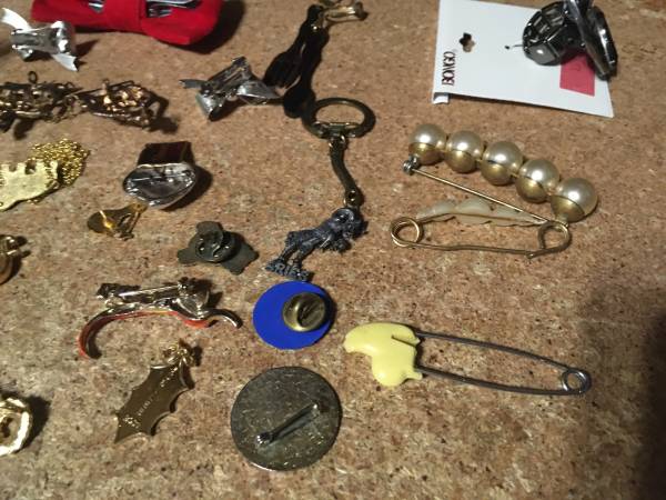 CASH ONLY 3X NECKLACE ONE JADE, ONE BLUE BIRD, ONE SILVER AND BLACK LOT OF JEWELRY PINS EARRINGS BONGO RING ELEPHANT DOG PANDA BEAR GIRL SCOUTS PTA VINTAGE FORK AND SPOON CLIP ON EARRINGS VERY GOOD...