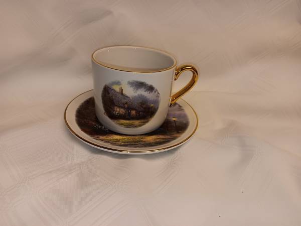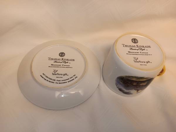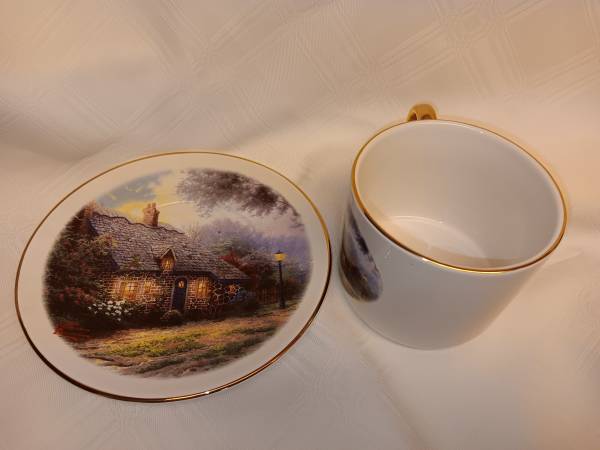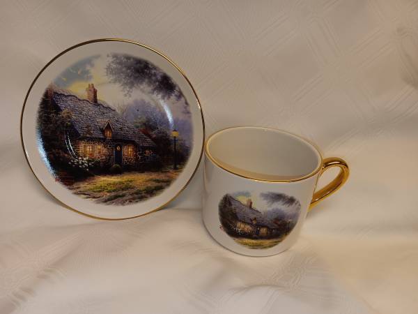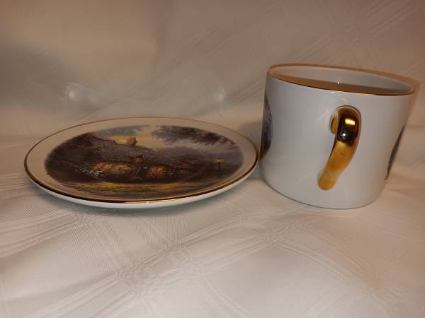 This Thomas KinKade Cup and Saucer set can be yours today. They are in like new condition with no scratches or chips. Cup and saucer have gold leaf trim. Contact me with any questions or concerns....