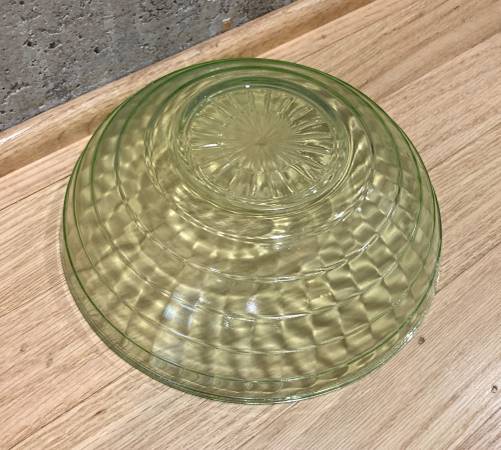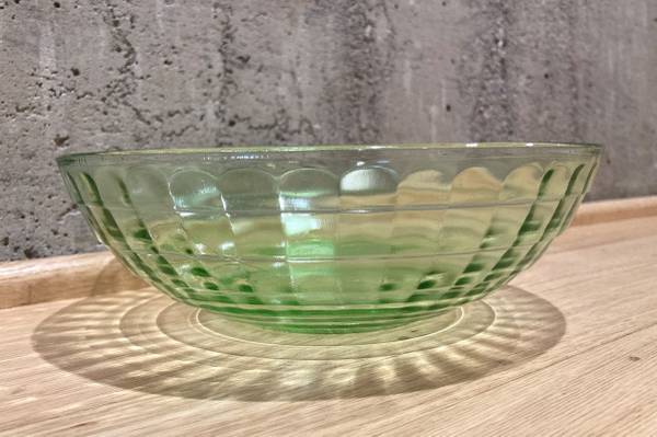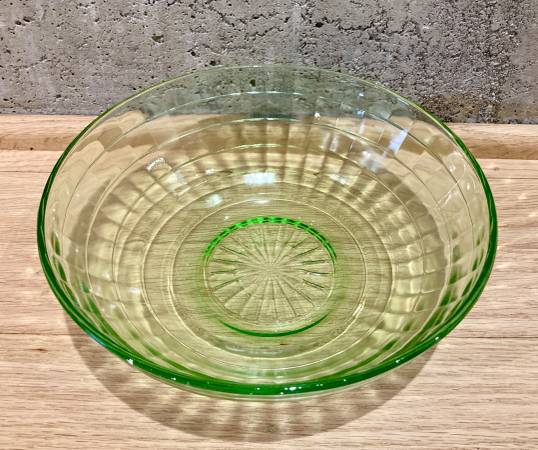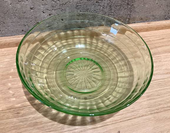 Vintage Anchor Hocking 8" Large Fruit Bowl in Block Optic pattern. Green vaseline/uranium depression pressed glass bowl features a geometric block optic design. Made in the USA.