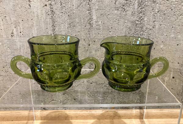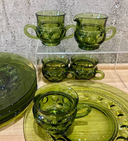 Set of 10 Vintage Indiana Glass [or Lancaster Colony?] glassware in King's Crown pattern that features thumbprint design. Includes olive/avocado green depression pressed glass open sugar, creamer, 3 cups and 5 snack plates with notch for cup placement. Made in the USA.