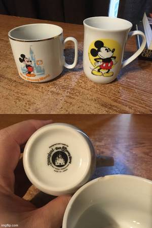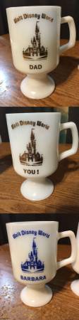 WALT DISNEY WORLD GOLD TRIM CUP HAS A SMALL CHIP ON IT AND HANDLE HAS BEEN GLUED BACK ON