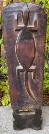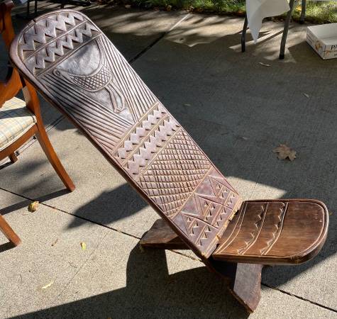 This hand-carved tribal chair was used as pithing chair or discussion, conference chair, or chief's chair; Senufo from Ivory Coast or Dogon from Mali with intricate carving