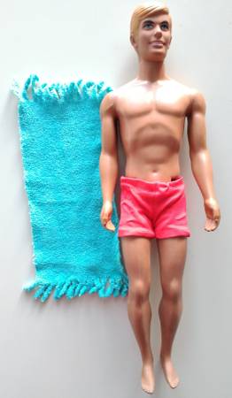 MALIBU KEN SUNSET DOLL with original red swimsuit and blue beach towel - 12" height with blonde hair and blue eyes - Mattel - vintage 1970s - like new condition - $49