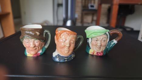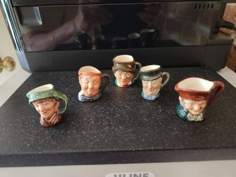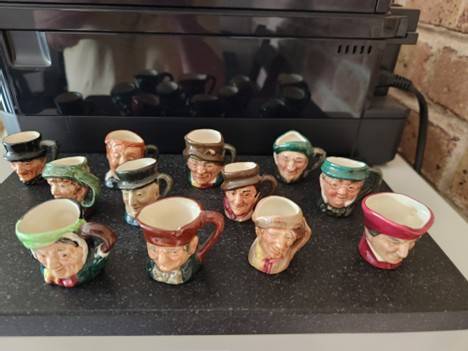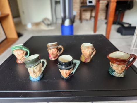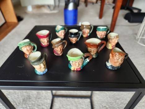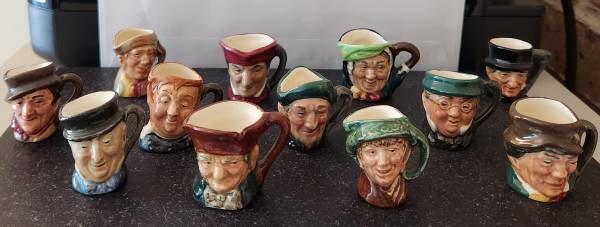 Best offer. Royal Doulton tiny original Dickens character jugs. In mint condition. Hand-painted 12-piece set, from 1940 to 1960. ‘Arry, ‘Arriet, Old Charley, Sairey Gamp, John Peel, Fat Boy, Mr. McCawber, The Cardinal, Sam Weller, Auld Mac, Paddy, Mr. Pickwick. Sitting on a black granite base.