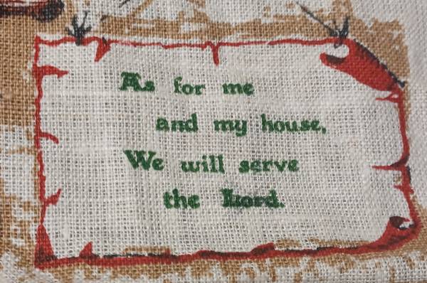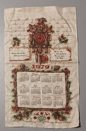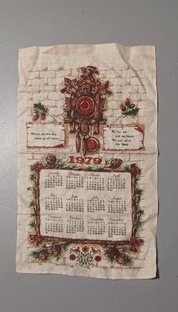 1979 linen full year kitchen calendar, autumn colors with Bible verses.There is an opening on the top to slide a rod threw to hang on the wall. Heavy, durable material, like new condition. 28 inches long by 16 1/2 inches wide. Near Route 60 and Peterson Road in unincorporated Grayslake.