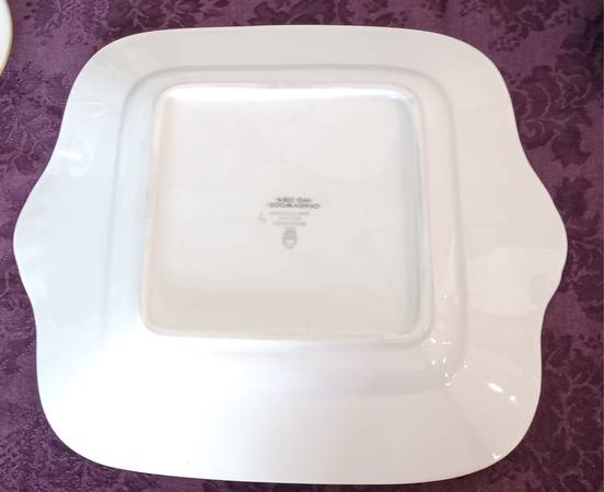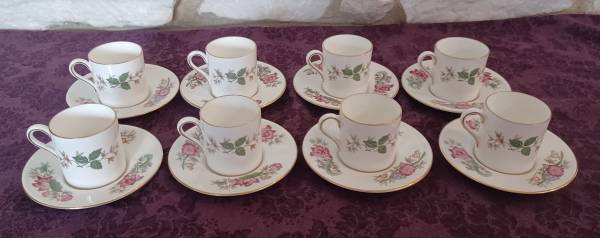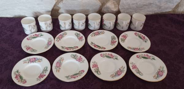 17 piece set of Wedgwood Charnwood bone china in a beautiful rose and butterfly pattern. Includes 8 Demitasse cups with 8 saucers, WD3984 plus dessert platter. Each cup is 2 3/16 inches high by 2 1/8 inches diameter and 3 inches wide, including handle. The saucers are 4 3/4 inches diameter. The dessert/biscuit handled platter is 10 3/4 inches wide by 9 1/2 inches deep by 1 3/8 inches high. Excellent condition, no chips cracks or breaks. Near Route 60 and Peterson Road in unincorporated Grayslake.