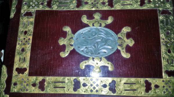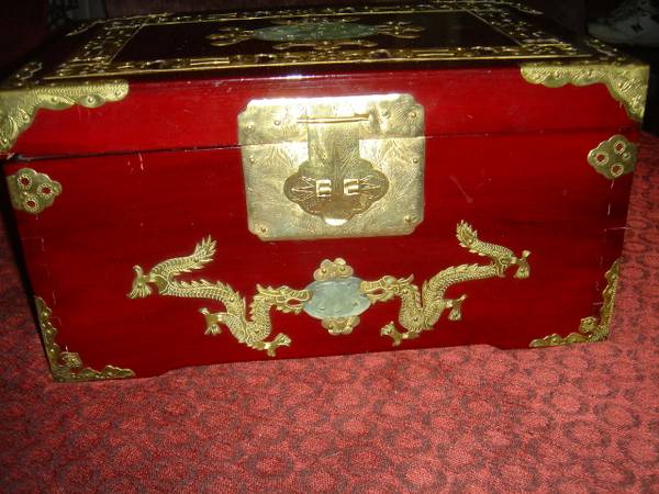 Beautiful Red Lacquer Jewelry Box with very nice brass corners, edges and decorations. Inlaid jadeite stone design on top and front. Jewelry Box, beautiful silk inside also.