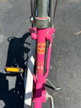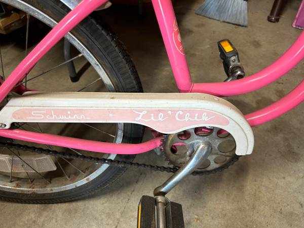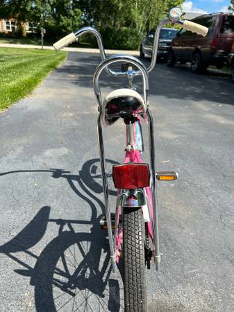 1980 schwinn lil chik stingray.pink and white,complete and all original,made in Chicago.seat is perfect,no tears,no scrapes,or scuffs.front wheel and tire:schwinn s-7 wheel little rust,schwinn westwind tire.rear wheel and tire:schwinn s-7 wheel little rust,schwinn stingray gripper slick.mickey mouse bell,front and rear reflectors,bike is in very good condition.$50