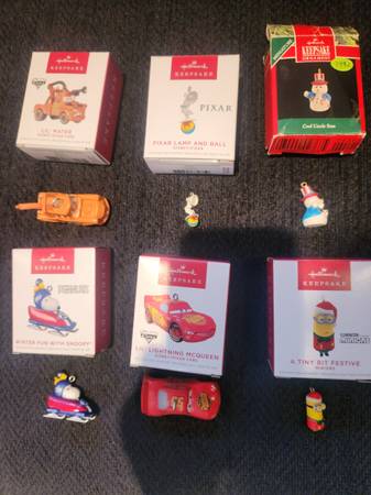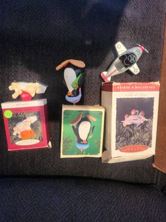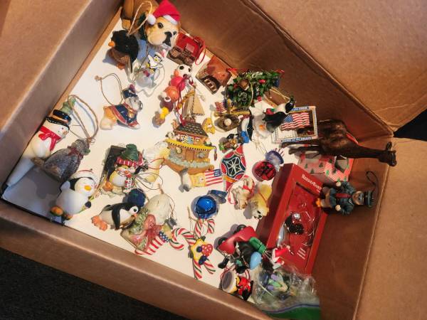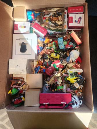 Box full of eclectic ornaments. Hallmark, Enesco, Russ and more. As is.