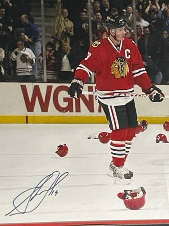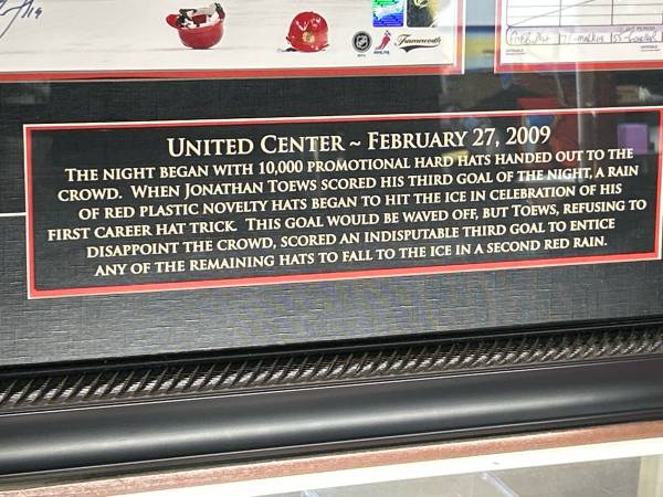 Professionally framed and fully authenticated Jonathan Toews display from the United Center, February 27, 2009 — the night Toews recorded his first career hat trick during the Blackhawks’ promotional hard-hat giveaway. When he scored his third goal of the night, thousands of red plastic hard hats hit the ice in one of the most memorable moments of the Blackhawks’ modern era. This is the official Frameworth edition featuring an 11x14 action photo, etched description plate, and a reproduction of the NHL game scoresheet from that night.