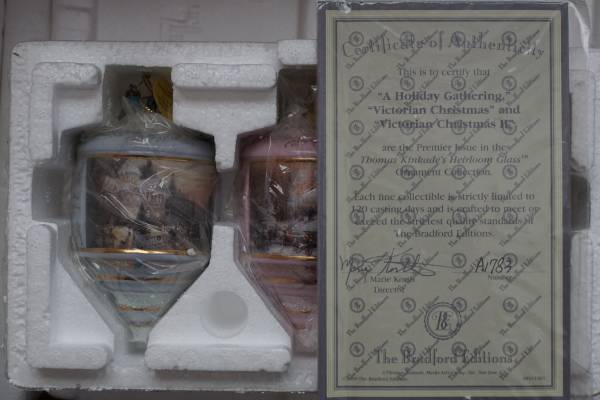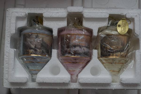 Bradford Exchange Thomas Kinkade Heirloom Glass Ornament Collection. Each set of three ornaments is in the original package with the certificate of authenticity. Each set of 3 is $50.00. This is...